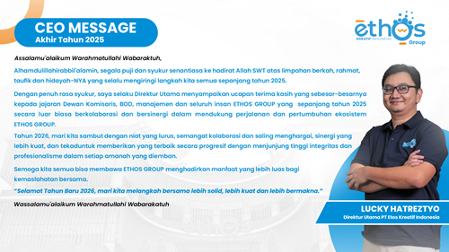 Dengan penuh rasa syukur, saya selaku Direktur Utama menyampaikan ucapan terima kasih yang sebesar-besarnya kepada jajaran Dewan Komisaris, BOD, manajemen dan seluruh insan ETHOS GROUP yang sepanjang tahun 2025 secara luar biasa berkolaborasi dan bersinergi dalam mendukung perjalanan dan pertumbuhan ekosistem ETHOS GROUP.
